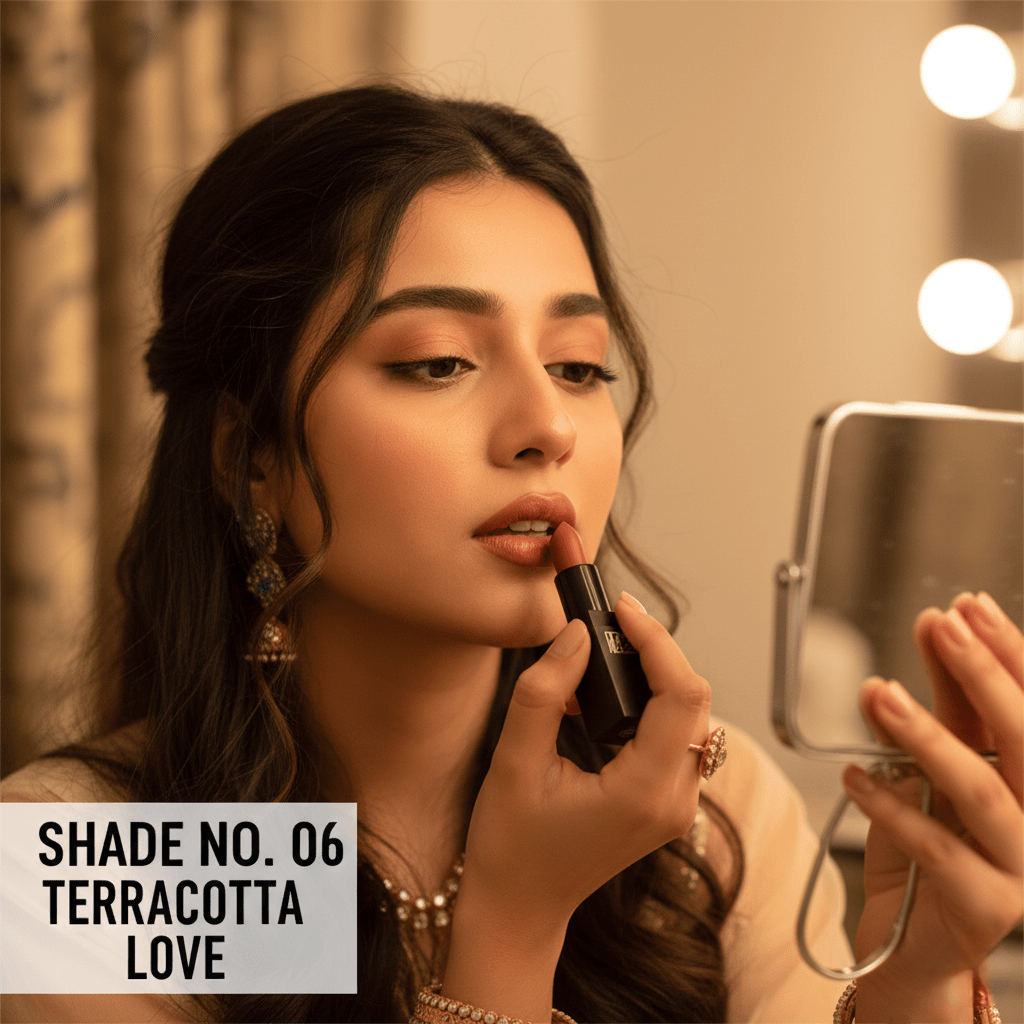 Discover the bold elegance of Onlyna Terracotta Love (Shade No.06 ). A long-lasting, high-pigment matte lipstick available at Nikhaar International. Perfect for professional and daily looks.