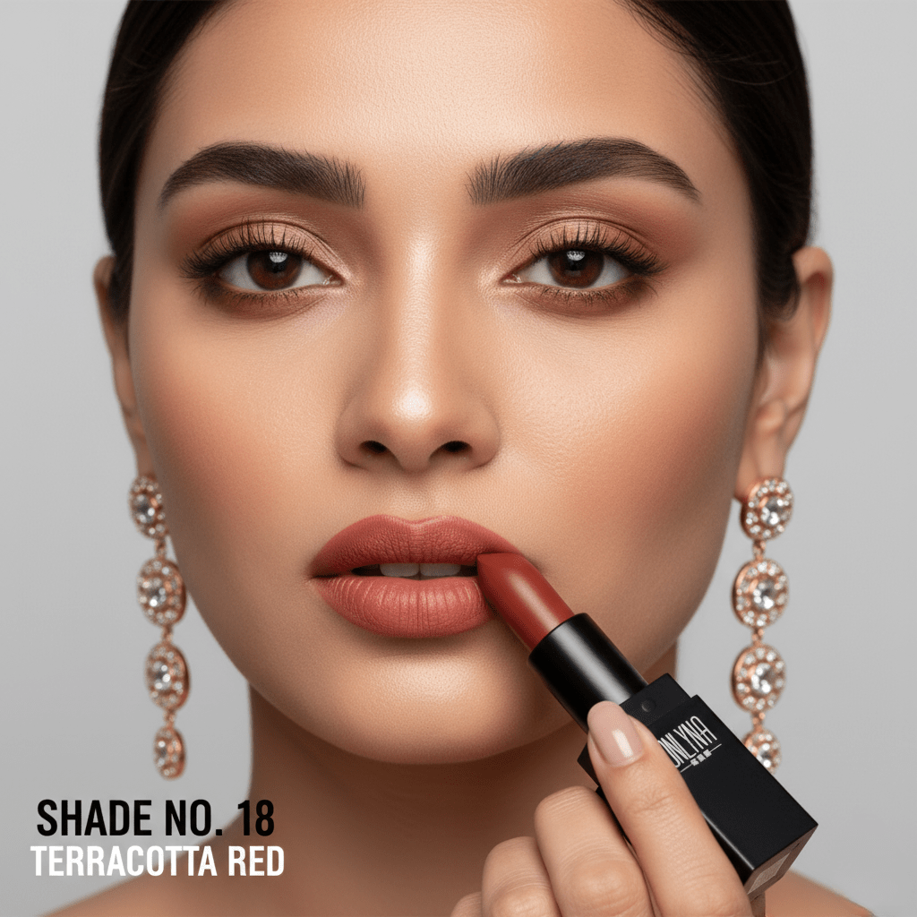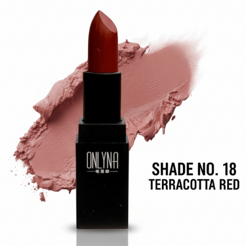 Discover the bold elegance of Onlyna Terracotta Red (Shade No.18). A long-lasting, high-pigment matte lipstick available at Nikhaar International. Perfect for professional and daily looks.