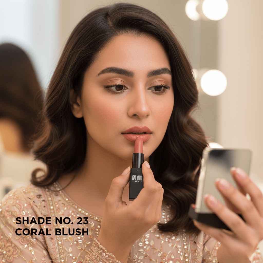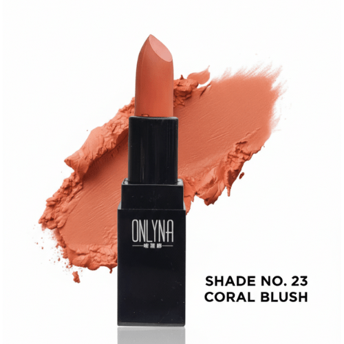 Discover the bold elegance of Onlyna Coral Blush (Shade No.23 ). A long-lasting, high-pigment matte lipstick available at Nikhaar International. Perfect for professional and daily looks.